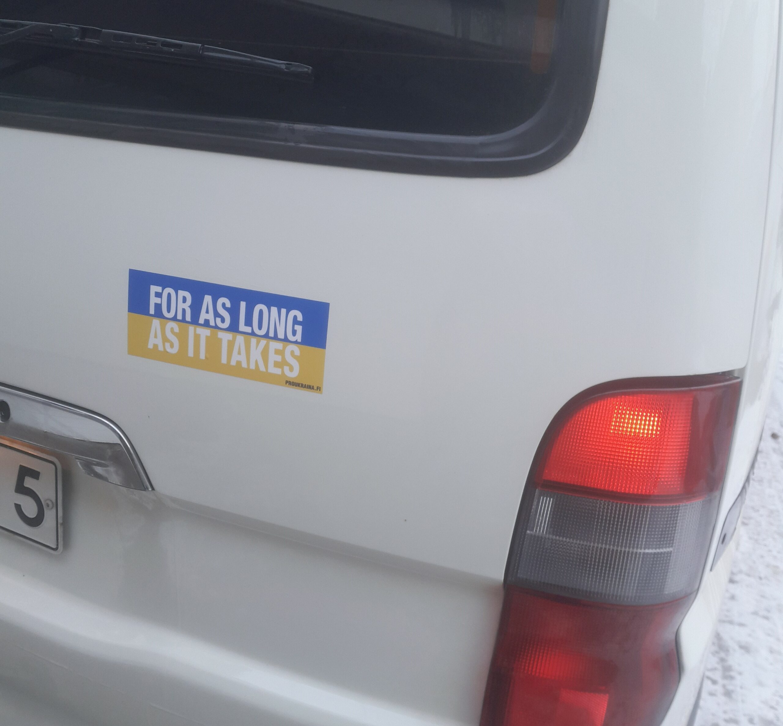 ”FOR AS LONG AS IT TAKES” -autotarra, jossa valkoinen teksti, sini-keltaisella pohjalla.